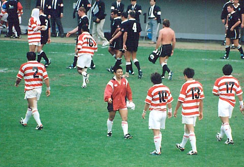 ノーサイド後、最後まで頑張った選手達を出迎える堀越選手。