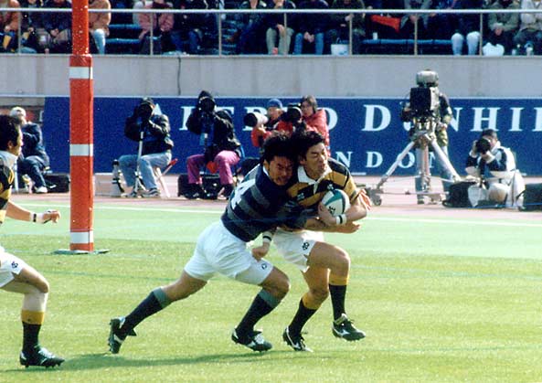 開始早々、自陣からカウンターを仕掛けようとした慶応FB栗原選手に対して強烈なタックルを浴びせる同志社WTB馬場選手。