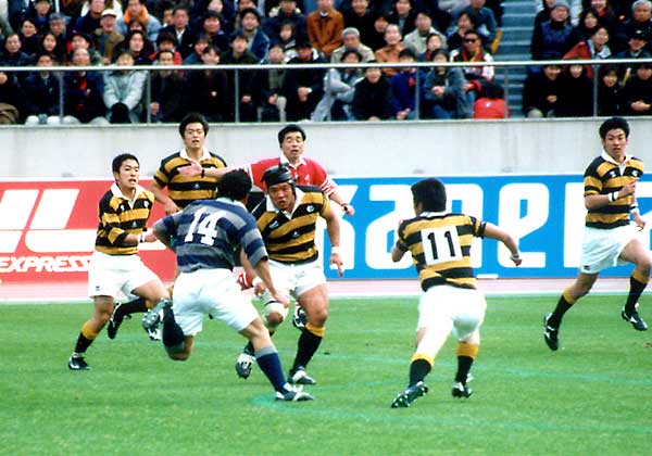 同志社WTB馬場選手を包囲する慶応ディフェンス。