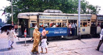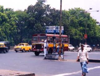 街を走るバス。このバスはまだ綺麗なほうだったが、実際はもっとぼろく頑丈、まるで鉄の固まりが走っているようだった。ちなみにこの国のメジャーな車メーカはTaTa社。ちなみに写真中央の白い服を着た人はおまわりさん。ここに立って手信号をしている。
