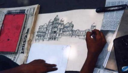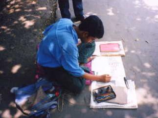 そういえば、バナラシへの列車のチケットを買いに行く途中、街中でこんな人を見かけた。歩道に座り込んで何かを描いている青年だった。