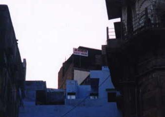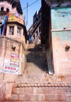 行き付けのチャイ屋の付近からガンジス河を背にするとこの光景が見える。ちょっと見づらいかもしれないが、写真中央の看板がある。ちなみにこのGuest Houseの屋上からガンジス河を眺めるのも結構よい。ただし野生の猿がよく遊びに来ているので注意が必要。まあ、朝方は来ないが、でも引っかかれたら大変だ!