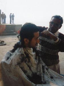 そんなとき河岸で青空床屋をしているおやじがおれたちに声をかけてきたので、耳そうじに続くみやげ話の第2段としてまxは髪の毛を切ってもらうことにしました。