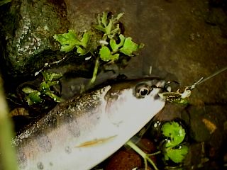 都内をふらりと昼に出て初めて入った栃木の渓へ。人出も多くのんびりとはできません でしたが、夕方近く、曇ったとたんに、スピナーにヒット。これに気をよくして上流に 移動しながら2匹を追加。結構、楽しめました。