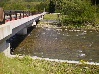 御所湖に注ぐ雫石川(竜川)の一大支流。赤渕付近より上流には人家がなくて環境抜群 だったが、近年商店その他ができたり、また、岸沿いに走る秋田新幹線の工事で大きく 変わってしまった。写真は新しく架け替えられた木滝橋。橋下の深場はなくなり、往年 の面影なし。この上流へと舗装された林道が続いている・・・・・