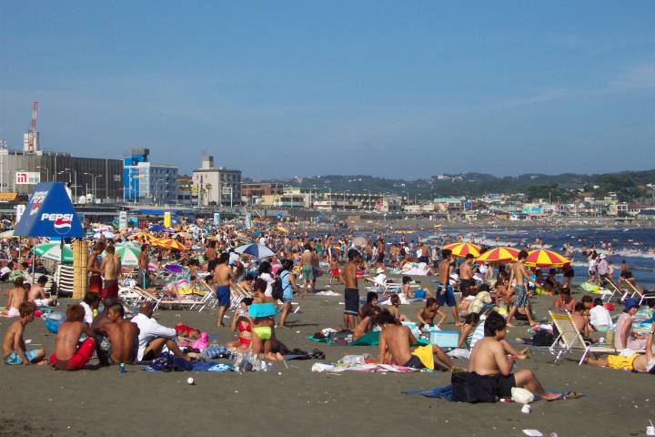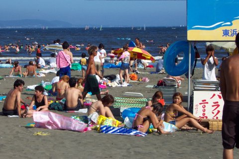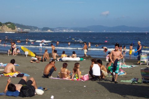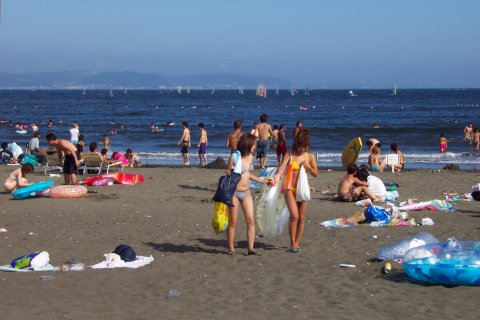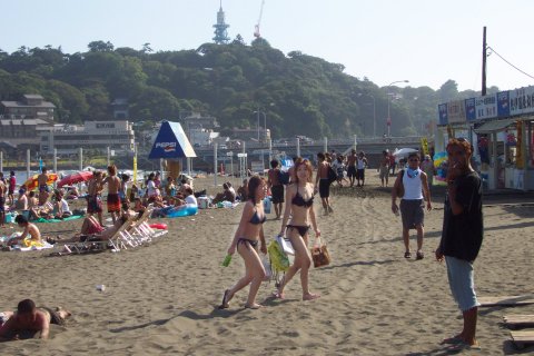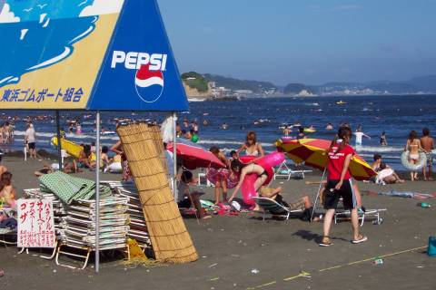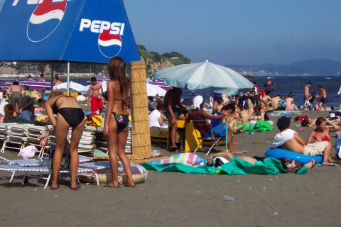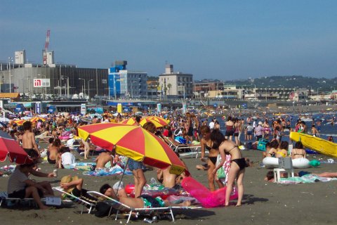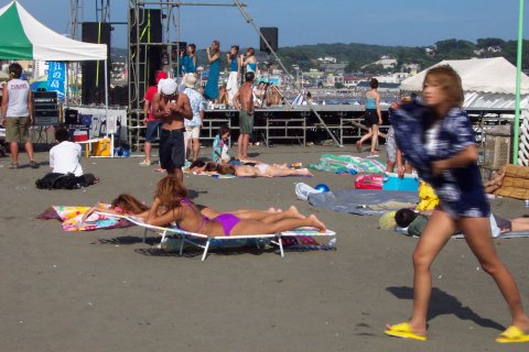 人、人、人…。 通称江の島海岸、正確には『片瀬東浜海水浴場』と言う。「湘南」の中心地であり、おそらく日本で一番賑わう海岸だろう。 東浜の海水浴場としての歴史は、少なくとも戦前から脈々と続いている。少し前までは、小田急の駅がある西浜の方が海岸も広く、各種イベントも頻繁に行われて賑やかだったが、不況のせいか、今年は圧倒的に東浜だ。 それにしても、人、人、人…。 そういえば今日は終戦記念日。実に平和な風景である。 |