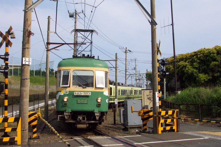 峰ヶ原信号場〜鎌倉高校前、鎌倉プリンスホテル方面への踏切を、後輩の1000型とともに進行する500型。最新鋭20型の登場に伴い、2003(平成15)年1月5日のさよなら運転で引退することになった。