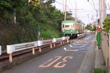 海岸沿いの国道に対し、こちらは旧道。観光シーズンには溢れた車で電車も遅延する。江ノ島〜腰越間。