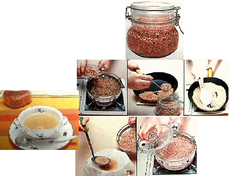 材料:玄米1カップ,水6〜7カップ,食塩 作り方:1)厚手のフライパンを弱火にかけ、玄米を焦がさないように気長に炒ります。上手に炒るほどおいしいス−プがとれます。 2)キツネ色になったら、水の入っている鍋に(1)を入れ、中火にかけます。 3)ふきこぼれないようにフタをずらし、ス−プの量が半量になるまで煮詰めます。 4)(3)を塩で味付けしてふきんなどでこします。 用い方 ス−プは飲むたびにあたためて、こしカスの玄米も一緒に食べます。玄米は多めに炒って、さめてから密閉容器にいれて、小出しに使うとようでしょう。 |