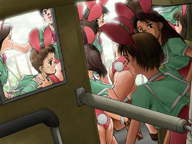 しかし、きっかけになった一枚(s_b_9.jpgだったかな?)で通勤バス風景を描いたところ、「いや〜こんな“通勤電車”に乗ってみたいですねぇ〜」との多々なる感想をいただきました。バスなんです、バスぅ〜。感想いただけたのはなんとも嬉しい限りなのですが(今でも募集中(^^;))、やはりバスを電車のままでおわらせてはいけないと再チャレンジしたのがこの一枚です。うまくいってますでしょうか?