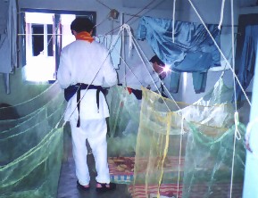 ホワイトフィールドのアシュラム内の一室 ここに7人でとまりました。裸電球が一つ。 それぞれの布団に蚊帳を張っています。 部屋を出る時は、窓を閉めないとサルがいたずら をしに来るそうです。 |