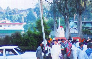 コダイカナルのホール入り口(門) ダルシャンに参加するためここで一列になって待つ。 くじ引きはない。勿論、男女別々です。 写真はダルシャンが終わり帰って行くところ。 |
