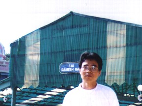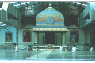 ホワイトフィールドのサイ・ラメシュ・ホール 各自、自由に入れる。広さは2000人位が 入れそうだ。ほとんどの人は座布団持参であ る。床は石畳、夕方は屋根はあるのだが暖ま っている。熱気でボーッとなるがダルシャン が始まり、スワミが出てくるとそんなことは 忘れてしまう。 |