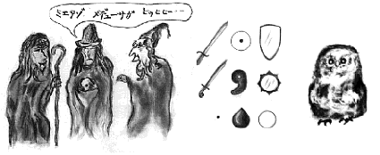 次に天帝の侍女が《知恵の神・梟》を持っており、天帝は梟をペルセウスに与えよと命じたが、侍女は『本物は勿体ないから』と《鍛冶屋に造らせた機械仕掛けの梟》を与えた。