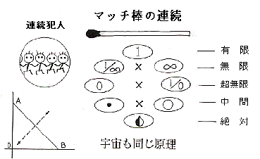 つまり、5センチのマッチ棒も《無限小で測れは無限大》で《ゼロ点なら超無限大》だから《無限や超無限》はどこにでもある現実だったのである。