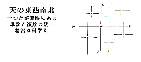 つまり「ここにも有り、あそこにも在り、而も世界に一つしかない《大X》」を狙ったとき、それは《東西南北の方角》で、世界に一つで無限にあり、これなら観念論的な幻想や唯物論の物質でもなく、而も《全方角で360度の精密な科学的存在》ではないか!