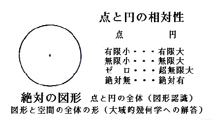 ところで、無限を超えて《ゼロと超無限大》に達しても《無と有の相対界》から出てはいないが、東洋の《絶対無》や反対の《絶対有》は、相対と絶対の中間地帯で言語を超えるから《非言語的な図形の点と円》で示すのが良かろうと判断した。