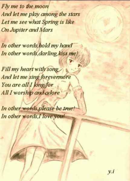 もともとフルカラー作品なんですが色を落としてみたらいい感じになったそうです。 でもちょっと物足りなかったので「FLY ME TO THE MOON」の歌詞をつけて 目に赤色をいれて完成させたそうです。