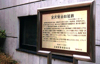 坂を下りて右手に曲がると、菊坂へ抜ける小さな階段が左に見える。菊坂とこの通 りはちょいと段違いになっているのだ。階段には、近所の方が置いた植木鉢が無造作に並べられていて、いかにも東京の下町らしい。そして階段わきには写 真のような「宮沢賢治旧居跡」という看板が掲げられていた。文京区は大変親切である。ただ、該当住所の場所が個人宅であるためか、史跡標は当地の目の前の階段に設置されていた。 賢治が「童(わらし)こさえる代わりに書いたのだもや」という作品たち(「注文の多い料理店」に収録されている作品をはじめ童話の第1稿のほとんど)は、ここで生みだされたのだ。「原稿から字が一字一字飛びだしておじぎした」のだ−そんなことを思いながら、しばし目をとじ頭を垂れる。 賢治とは直接関係ないが、この菊坂近くにあった菊富士ホテルは、芥川龍之介、石川淳、菊池寛、佐藤春夫、坂口安吾、竹久夢二、宇野浩二、宇野千代などなど、有名な文人が出入りしていた場所である。なぜかというか当然というか、この方たちのほとんどが「赤い鳥」などの当時の雑誌に童話を書いている。大正時代の子どもたちは豪勢な童話を読んでいたのですね。 |
