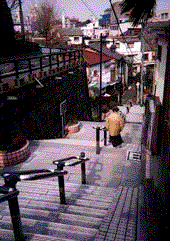 り過ぎ、坪内逍遥旧居跡の横から炭団坂の階段を下る。いよいよ下宿先は近い。下宿先の稲垣家では、未亡人がお手玉