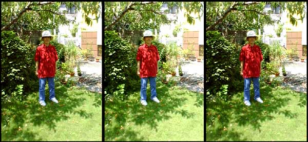 「遠くを見る目」で、ぼんやりと左右の点をながめていると、2つの点が3つに見えるようになります。(2) これで準備ができました。そのままの目で真ん中の写真を見れば立体画像です。
