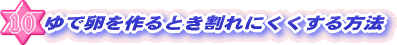 | 卵をゆでるとき塩や酢を入れると割れにくい。塩や酢にはタンパク質を早く固める働きがあります。もし卵をゆでている途中でひびがはいっても、湯に塩や酢がいれてあると、すぐに卵白が固まるので、中身が外に流れでません。しかし、冷蔵庫から出したての卵は、割れやすいので、室温にしてからゆでることです。 |