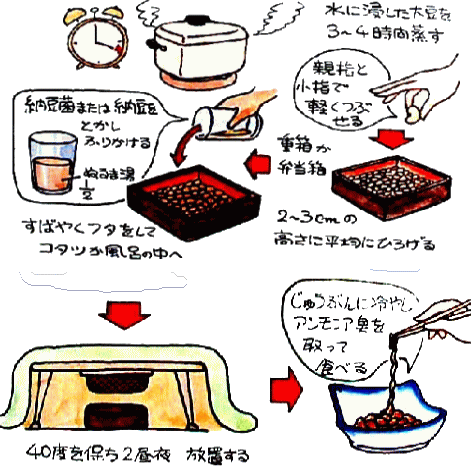 (材 料) 大豆100g 納豆菌1g(市販の納豆少量でもよい) (作り方) 1)豆腐の作り方(1)の要領で水に浸した大豆を3〜4時間蒸し、親指と小指の間にはさみ軽くつぶせるようになったら、重箱か弁当箱に2〜3cmの高さで平均に広げます。 2)(1)の品温が40〜45度まで下がったら、納豆菌または、既製の納豆少量をカップ1/2ぐらいのぬるま湯に溶かして、まんぺんなくふりかけます。 3) ふりかけたら素早くふたをして、コタツの中か風呂の中で、品温40度を保ちながら二昼夜放置します。できあがった納豆はじゅうぶんに冷やし、アンモニア臭を取り除いて食べます。 おばあちゃんの知恵袋 |