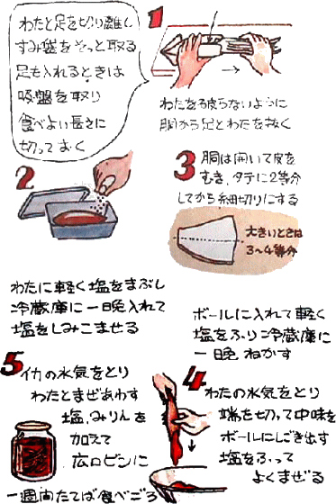 (材 料) いか300g 粗塩60g みりん300cc (作り方) 1) いかをまな板の上におき、左手で胴を押さえ、右手で足の根元を持ち、わたを破らないように抜きます。いかの裏側の真申に切り目を入れておくと簡単に抜けます。 2)わたと足を切り離し、すみ袋を破れないようにそっと取り除きます。このときイポも取り除くとよく、足も入れるときは、吸盤をこそげて、適当な大ささに切っておきます。 3) すみ袋をとり除いたわたは軽く塩をまぷしておき、しばらくしてしみ込んだら、ふきんで水分をとります。ふたつき容器に入れて、冷蔵庫で一晩塩をしみ込ませるのもよいでしょう。 4)胴は一枚に開いて皮をむき、二等分(いかの大きさによって四等分)して細切りにし、ポールに入れて塩を軽くまぶして冷蔵庫に一晩入れておきます。 5) 乾いたふきんでわたの水気をそっと拭きとり、袋に切り目を入れて、手に力を入れて中身をしこき出し、塩をふってよくまぜ合わせます。 6)(5)に(4)を加え、軽くまぜ合わせて、壺か広口瓶に入れて、塩、みりんを加えて、冷暗所で保存します。毎日朝夕よくまぜ合わせます。1週間たったころが食ぺころです。 おばあちゃんの知恵袋 |