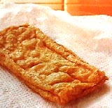 油あげ1枚(25グラム)はペ−パ−タオルでくるみ、ラップをかけずにレンジで1分加熱する。とりだして粗熱が取れるまでそのままにしておく。油がペ−パ−タオルにしみこんだら、ペ−パ−タオルを取ります。