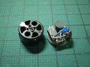 コンバータをこのパーツと同じ大きさにできればそっくり差し替えることで本体は無改造になります。非常に格好悪い作りですが、写真右側がコンバータ基板です。