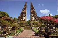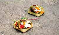![]() これはチャナン(Canang)と呼ばれ、一家の主婦が毎朝家庭の精霊の存 在するところに、米飯と花と線香をお供えとして捧げるもの。祖霊に 捧げるためのものと悪霊のためのものとがある。バリの人々が熱心に お供えを欠かさないのは、祖霊の供養と悪霊を怒らせないようにする ためである。 チャナンは、精霊へのお供えとしてバス、タクシーの運転台、ホテル のフロント等にも飾ってある。 ●市松模様の意味は何?