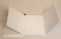 表紙の紙を折ります。長く伸びた部分を半分に折り(1)、本文用紙2枚(4ページ)をはさみこみます(2)。表紙の台紙代わりにするわけです。