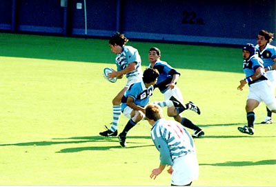 ケンブリッジは長身センタービッドウェル選手を軸に攻撃を組み立てたが、悉く萩谷選手のタックルの餌食に。後半、萩谷選手が交代してようやく本領を発揮し出す。