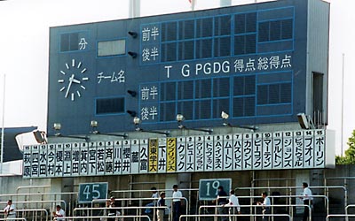 この日はスコアボードが故障中ということで、選手名の下に黒板を設置し、手書きで得点経過が表示された・・・。