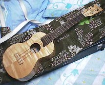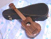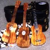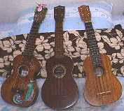| こちらはハワイでゲット!! コア製のウクレレ 左からケリィ、 カマカ('60年代初期のもの)、 タンギ(これは友人に頼まれて 買ってきたもの) | ![]() |