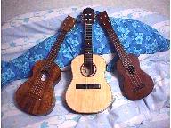 私の愛器たち、左から自作の全音キット 中央、春日楽器のメロウトーン(’60年代のもののようだ。)、 右、Pupukea UF-40。こちらは全部国産です。 |