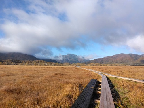 見晴らし十字路からの至仏山 雨上がり雲と至仏山 すっかり秋模様の尾瀬ヶ原 哀愁漂う〜 2025/10/12 友人撮影 |