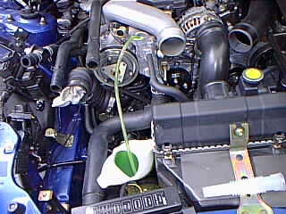 水温計取付(AT車用サーモスタットカバー流用) 前に乗っていた4型FDから外したHKS製46φ電子式温度計を5型へ水温計として装着しました。前は温度センサー付ける為にラジエタアッパーホースを切断しアダプタを割り込ませていましたが、前々からホースを切断することに抵抗を感じて(冷却水漏れへの信頼性低下)いましたので、今回はセンサー用の穴が余計に開いているという噂のAT車用サーモスタットカバーを利用する事にしました。(自分でタップを立てられる人はこれを買わずに穴をあければ良いだけの話ですが・・) ![]() 上の写真が、噂のAT車用サーモスタットカバーです。既に温度センサー用アダプタ(右端の金色に見える部分)を差し込んでいます。サイズは M16xP1.5 の物が利用できます。ちなみに、現在注文して手に入るサーモスタットカバーは、上部の注水口の台座が一体形成になっていますので、台座がプラスチックで出来ている初期型FDの方は、このやり方で水温計を付けると、同時に台座の強化を行なった事になりますので、オススメです。 交換するには、エンジンルーム内の作業スペースを確保するために、エアクリーナ、タービン→インタークーラーまでのパイピングを外します。一通り外したら、サーモスタットカバーより冷却水を抜き取ります。 通常のやり方だと、ラジエタのドレンコックより冷却水を全て抜き取るのですが、そこまでやってしまうと作業後に面倒なラジエタのエア抜き作業を念入りに行なう必要がありますので、私はチューブを使って注水口より作業の邪魔になる冷却水のみを抜き取る事にしました。ブレーキのエア抜きに使うホースを注水口へ突っ込んで、口で冷却水をホースの端まで吸い上げ、一気にホースを下へ向けて重力にまかせてオイルジョッキへ流し込みました。 ![]() 事情により既にAT車用サーモカバーを装着している写真しか用意できませんでした サーモスタットカバーは、3個のナットで固定されていますが、このボルトを外すにはエアポンプのベルトが邪魔になり工具が入りませんので、オルタネーター(エンジンルーム中心)の右にあるテンション調整用のネジを緩めてベルトを緩めます。サーモカバー固定用の3個のナットを外してもサーモカバーが外れない場合は、プラスティックハンマー等で軽く叩いて下さい。 ![]() 後は、温度センサーをAT用カバーへ装着(冷却水漏れ対策としてアダプタに水道用シールテープを巻付け、その上に液体ガスケットを塗付しておく事)し、レベルセンサー(ケーブルが1本付いている黒いセンサー)を移植したら、AT用カバーと交換します。 ![]() 交換作業が終わったら、分解した手順を辿って、各パーツを組付け、冷却水を補充します。ちなみに、サーモスタット自体にゴムパッキンが巻いてあるので、サーモカバーは1kgf・m程度のトルクで締め付けるだけで冷却水漏れは起こらないみたいです。それから、緩めたベルトは忘れずに締め直しておいてください。エンジンを始動し、サーモカバー及び温度センサーの周囲から冷却水が漏れていない事を確認すればOKです。 交換直後は、サーモカバー内にエアが残っている可能性があるので、急激な運動は控えて下さい。運転した翌朝にでも注水口を開けてみて、もし冷却水が入っていなかったら補充(水道水で可)し、これをエアがなくなるまで繰り返して下さい。注水口を開けて補充の必要が無くなったら、全開OKです。(私の場合は5回ほど繰り返しました) ローテンプサーモスタットについて 実は、最初サーモスタットカバーの交換は行き付けのお店にお願いしたのでした。その時ついでに、お店に転がってたローテンプサーモスタットを安く買い叩いて交換したのでした。交換当初は水温が目にみえて下がったので喜んでいたのでしたが、夏になり外気温が上がりエアコンを使うようになると、水温が下がりすぎてアクセルを踏み込んでも思うように加速しないというトラブルに見舞われました。 いわゆる、オーバークールという状態です。FD3Sはエアコンを使用するとコンデンサー(熱交換器)を冷やす為に水温に関わらず電動ファンを動作させます。ここでノーマルサーモスタットだと水温が80度以下に下がろうとすると、弁が閉じ冷却水の循環を停止してオーバークールを予防しますが、ローテンプサーモの動作温度は65度なので、その温度まで水温が下がってしまうのです。ちなみにFD3SのノーマルECUは機関保護のために水温が70度に満たないとスロットルボディの動作を送らせて吸入空気量を制限するようです。。。 と言う事で、上記写真は全てノーマルサーモスタットへ戻す時に撮影した写真なのです。 |