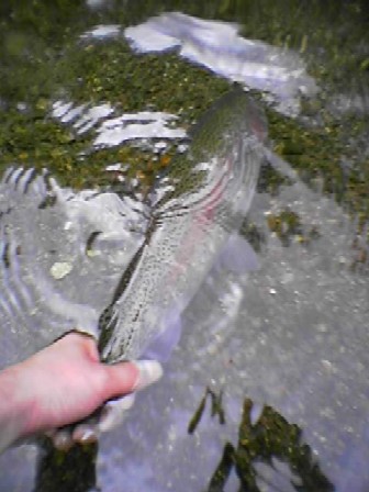 阿寒川でつれたのがこの50cmくらいの虹鱒。うーん、やはり北海道!!!。持ってきたネットはまったく役に立たない大きさ。