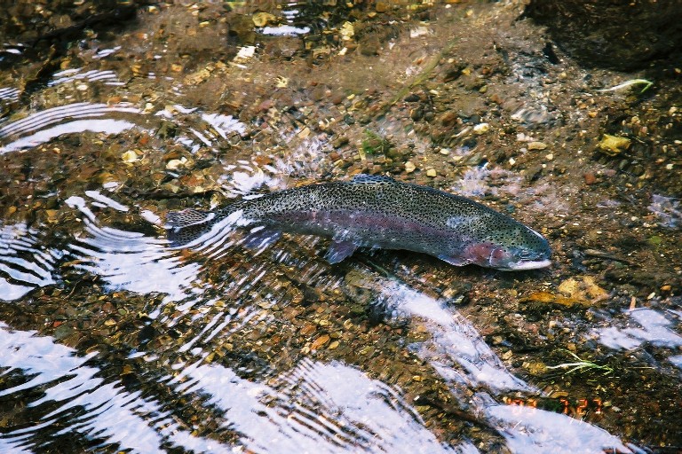汗だくになってハアハア言いながらの格闘の末、陸揚げした虹鱒。渓流用のロッドと5Xティペットだったので、ちょっとあぶなかったなぁ・・・。とりあえず砂利の上でごめんなさい。