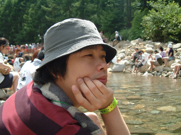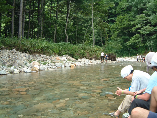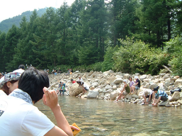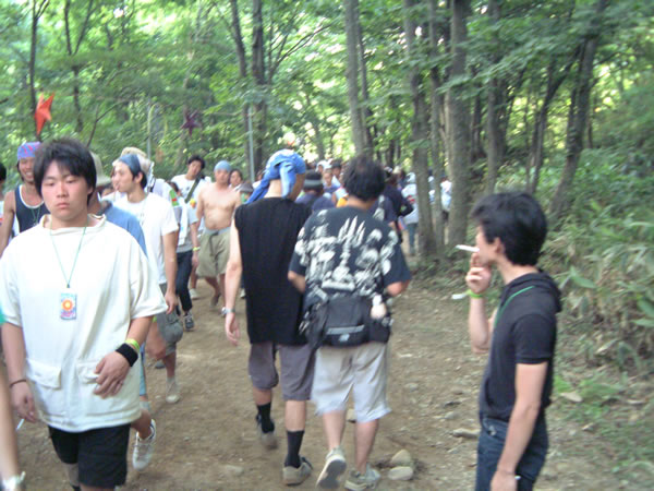 駅前に出て、シャトルバスの乗り場に並ぶ。割とすぐ乗れた。そこから苗場まで約40分。湯沢駅ではそうでもなかったが、苗場はさすがに高原だ。空気が冷たく涼しい。かなり気持ちいい。天気もまぁまぁ良い。とりあえず、バスを降りて、横目に巨大な苗プリと緑の山々を眺めつつ歩くこと30分、入場ゲート到着。すでにゲート前では行列ができている。などと思ってたら、前方に、全裸で、靴だけ履いて一人で並んでいる男の人を発見。ホントにまさにフルチン。おしりしか見えなかったけど。近くにいたMTV取材班もびっくり。しっかり撮影していたようだ。でもこれは放映されることはないだろう。一体あの人はどこから全裸でやってきたのだろうか?謎である。いろんな人がいるものだ。