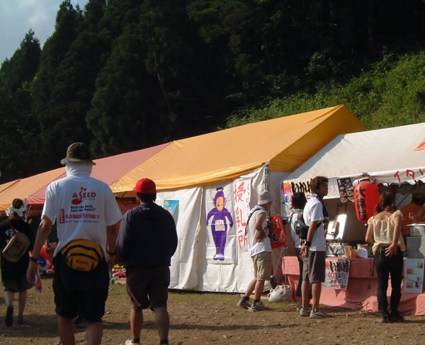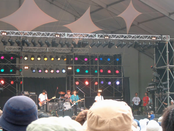しばらく寝てたりするうちに、ステージにはスマッシュ社長が出てきてご挨拶。そしてジョーイ・ラモーン追悼の儀式が始まる。それを横目で眺めつつ、お昼も近くなって来たので、屋台コーナーへ移動。パエリアを食う。結構いろんな食べ物がある。焼きそば、たこ焼き、フランクフルトのようなジャパニーズ・メニューはほとんどなくて、タイラーメン、タイカレー、インドカレー、パキスタンカレーにヨーロッパはパエリア、フィッシュ&チップス他世界のメニューがいろいろ。雑貨屋さんなども含め、エスニック系が多い。ビールはハイネケンがメインだ。結局タイラーメンがいちばんおいしく、これは何度も食べた。ただ、夜になると、同じ500円でもみるみる具が減っていくのがわかって少し残念。食材が足りなくなってくるのはわかるけど…。