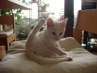 子猫と言うより若猫になってきた。まあ、精神的には自我が十分育っているとは言えないが。だから気にしないことは気にしないのかも。でもしつこい。今日はシャンプーしてやったらでかい声で鳴いた。非常に嫌だったようだ。名前は純、なのだがかみさんも俺も適当に呼んでいる。俺は「白イタチ」とか「麻呂」とか呼んでいる。体が長くて細いのだ。遊びでかみついたりすると耳が伏せて鼬のようである。麻呂ってのは、顔に毛の薄いところがあり、麻呂のようであるのとマシュマロのマロを掛けている。かみさんは「じゅんち」とか「にんにん」とか呼んでいる。後者は意味不明である。