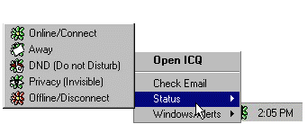 あなたがICQ商標の上で右クリックするとシステムトレーからICQにアクセスすることに加えて、あなたは、Statusボタンをクリックすることによって、状態を変えることができる。StatusボタンはICQウィンドウの下部の右のボタンである.。それをクリックすると、Statusウィンドウが開く。
