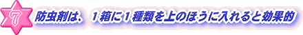 | 衣類を虫から守る防虫剤にはベンゼン系、ナフタリン、しょうのうの3種類あります。これらはいずれも常温で徐々に昇華し、ガスが飽和状態で滞留して殺虫効果をだすものです。このガスは空気より重いので、容器の上の方に多く入れたほうが効果的です。和服などで金箔のあるものは、金糸が変色しないよう、しょうのうを使うようにします。 |