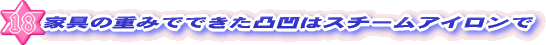 | 部屋の模様替えで家具を動かすと、畳やカーペットにくっきり跡がついてしまっています。まずあて布を用意し、跡がついていたところに置いて、上からスチームアイロンで蒸気を当てる。あまり長く当てると畳を傷めるので、加減を。しばらく置いておくと、畳が膨らんで元にもどります。戻ったら乾いた布で乾拭きして終わり。 |