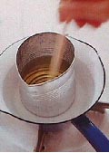 油が温まったら処理剤をふりかけ、完全に溶けるまで割りばしでよく混ぜます。 |