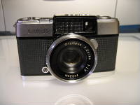 オリンパスPEN−Dのファインダーはこんな感じで ある。ハーフサイズカメラで135ミリ判を縦に二つに割ったサイズなので、縦型のファインダーが新鮮である。更に、レンズの焦点距離は3.2cmと書いて ある。135ミリ換算すると32mm×約1.4倍ということで45mmくらいになるのかな。EEシリーズの2.8cmより望遠寄りであが、標準レンズというところか。