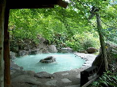 これで、七味温泉完全制覇! とはいえ、旅館がぜんぶで4軒だけれどね。 ここの露天も七味温泉の特徴である白い色の石膏が船底に薄く積もっていた。 写真で見るとすごい良さそうな露天風呂。露天を覆うように生え茂る数本のカエデが色づく秋には違った趣になるのでしょう。でも、見える風景はイマイチかなぁ。湯船の中に腰掛けられるような石がないので肩まで浸かるか、外に腰掛けるかしか出来ないのは冬になると寒くって辛いかも。夏のこの時期は外の岩に腰掛けてマッタリ出来てよかったけれど。 |