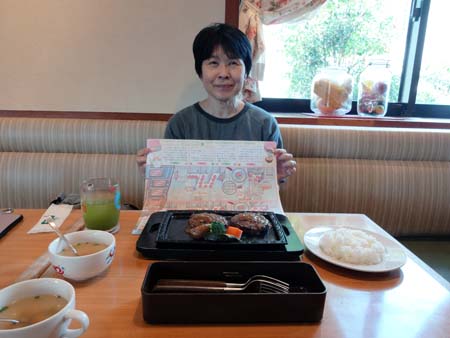 11:58席へ おにぎりハンバーグ200g・ドリンク・スープ・パンorライス 1,600円 牛肉100%が売りみたい。通常ドリンクは別料金だが今週はドリンクがセットで付くキャンペーンで最終日だった。毎月このお得なキャンペーンが1週間あるらしい。まさか、ドリンクがお得だから混んでたわけではないと思うが。 ミディアムがお店のお勧め。少し硬くなると言われたけど2人とも”よく焼き”で頼んだ。グニュッとした赤い肉は好きじゃないから。確かに少し固めの肉だったけど、美味しかった。 スープもご飯もパンも美味しかった。ハンバーグのソースはオニオンソースと、デミグラスソースで、どちらも美味しかった。 人気があるのは分かるけど、こんなに待ちたくない。店員さんとソフトドリンクで”かんぱーい”ってやる謎の儀式も恥ずかしい、2度目はない。